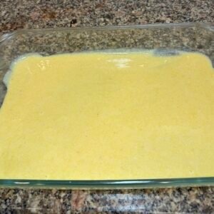 - Pour the cornbread mixture into the 9 x 13 pan and spread evenly.