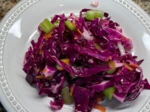 I adapted this recipe from a recipe a friend gave me, called “Angie’s Dad’s Best Cabbage Coleslaw”. This is my husband’s favorite coleslaw recipe. This Purple Coleslaw is a household favorite. It is vibrant, crunchy, and flavor-packed.